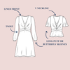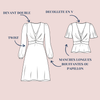 Solstice is een elegante jurk en kan ook gemaakt worden als een blouse. Het biedt twee opties voor de mouwen: vlinder mouwen of lichte pofmouwen met een een boord.